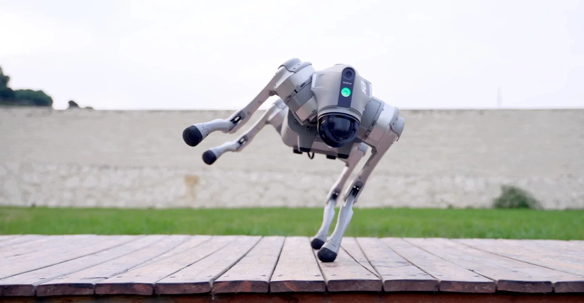 Robot dog leaping on a wooden platform outdoors, against a blurred background of grass and a wall.